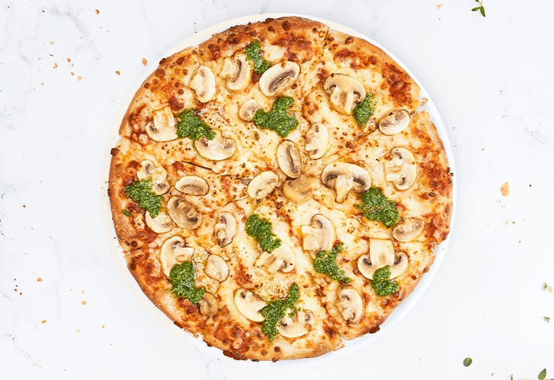 mit frischen Champignons, Basilikum-Pesto und extra Mozzarella